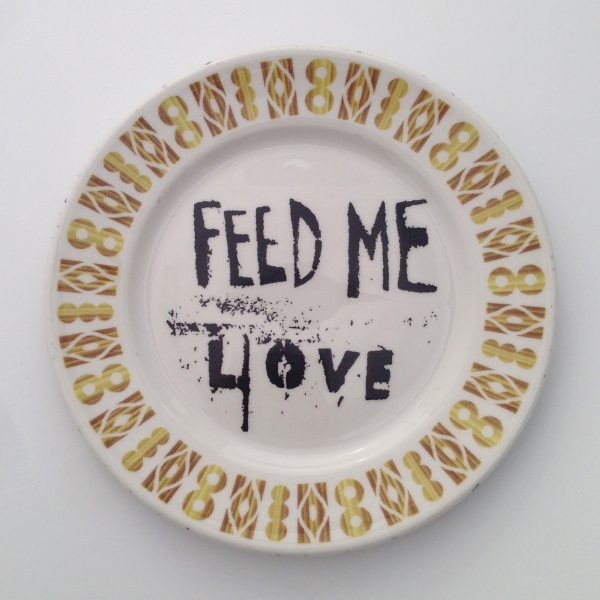 Screen-printed image of Canadian graffiti, here printed on a vintage diner plate (Dudson Russel Armorlite, England). Fully functional, images are permanently fired, in-glaze decals. Read more about this on-going project here.