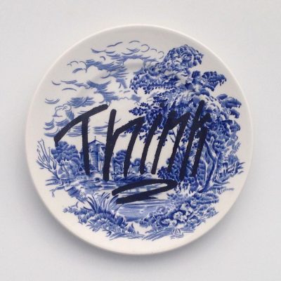 Screen-printed image of Canadian graffiti, here printed on a vintage side plate. Fully functional, images are permanently fired, in-glaze decals. Read more about this on-going project here.