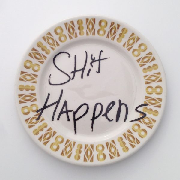 Screen-printed image of Canadian graffiti, here printed on a vintage diner plate. Fully functional, images are permanently fired, in-glaze decals. Read more about this on-going project here.